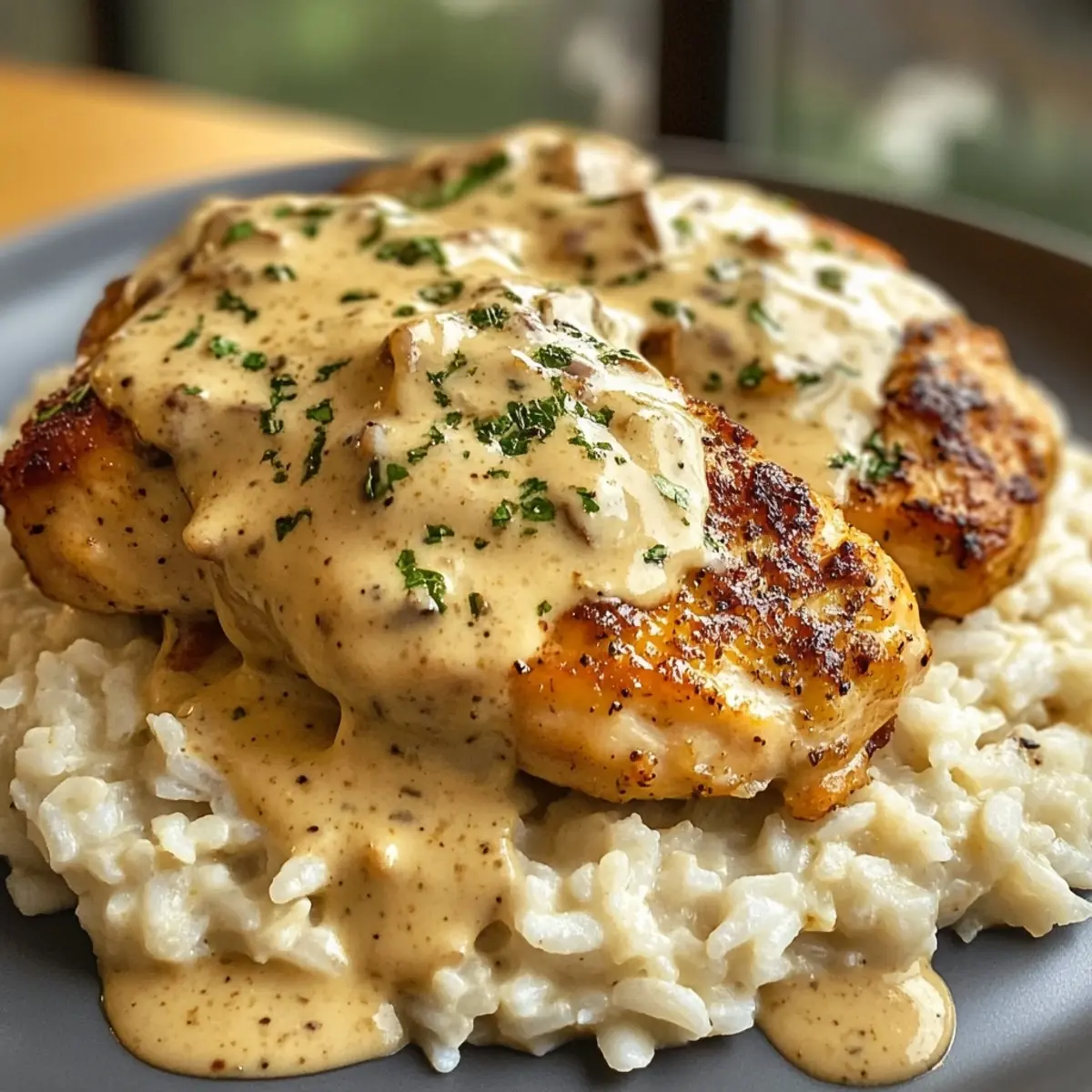 - Assemble and Serve: On a plate, serve a generous scoop of the fluffy rice, top it with the smothered chicken and a drizzle of sauce, then garnish with fresh parsley for a pop of color.