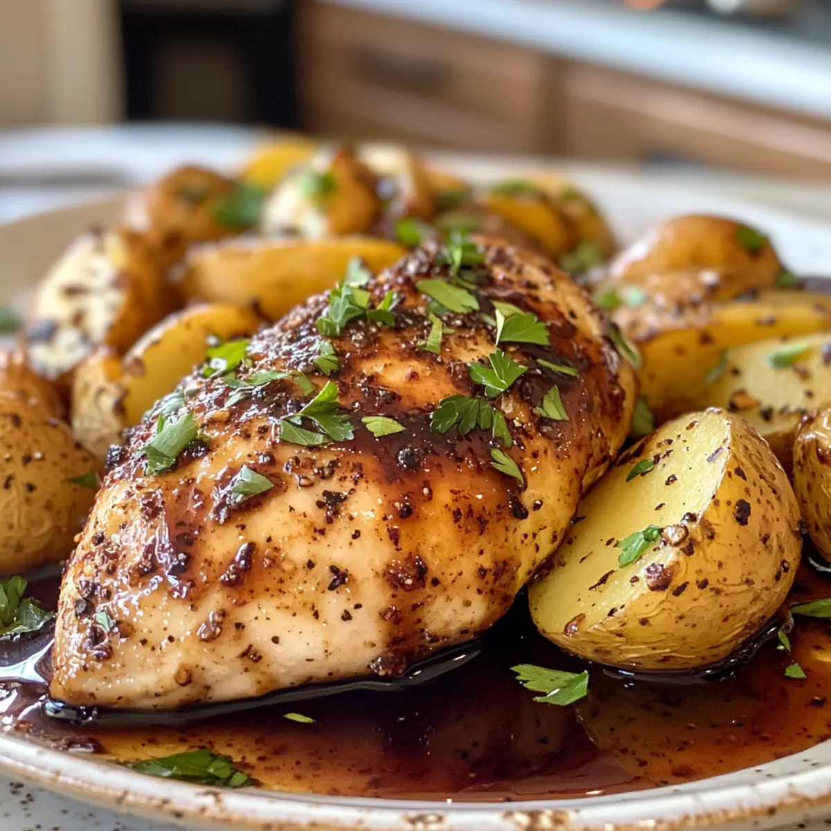 Assemble: On a lightly greased baking sheet, arrange the seasoned chicken breasts and the tossed potatoes. Drizzle the delicious balsamic sauce over everything, ensuring each piece gets a lovely coating.