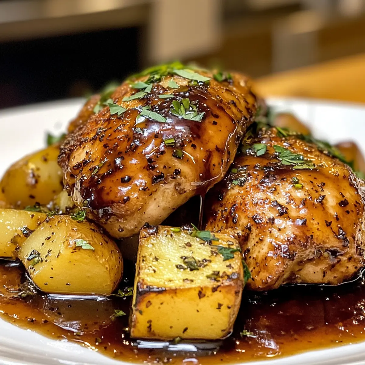- On a greased baking sheet, arrange chicken and potatoes, then drizzle with balsamic sauce.