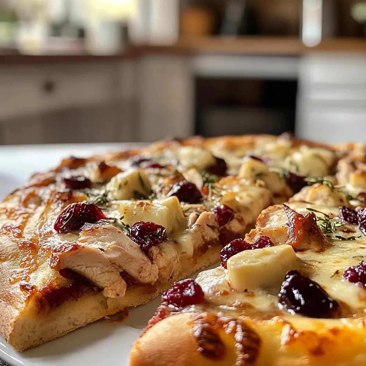 - Assemble the Pizza: Spread cranberry sauce on the dough, top with brie slices and shredded chicken, sprinkle fresh rosemary.