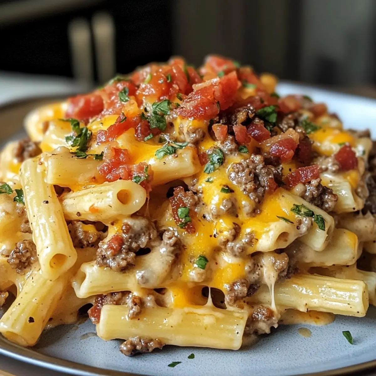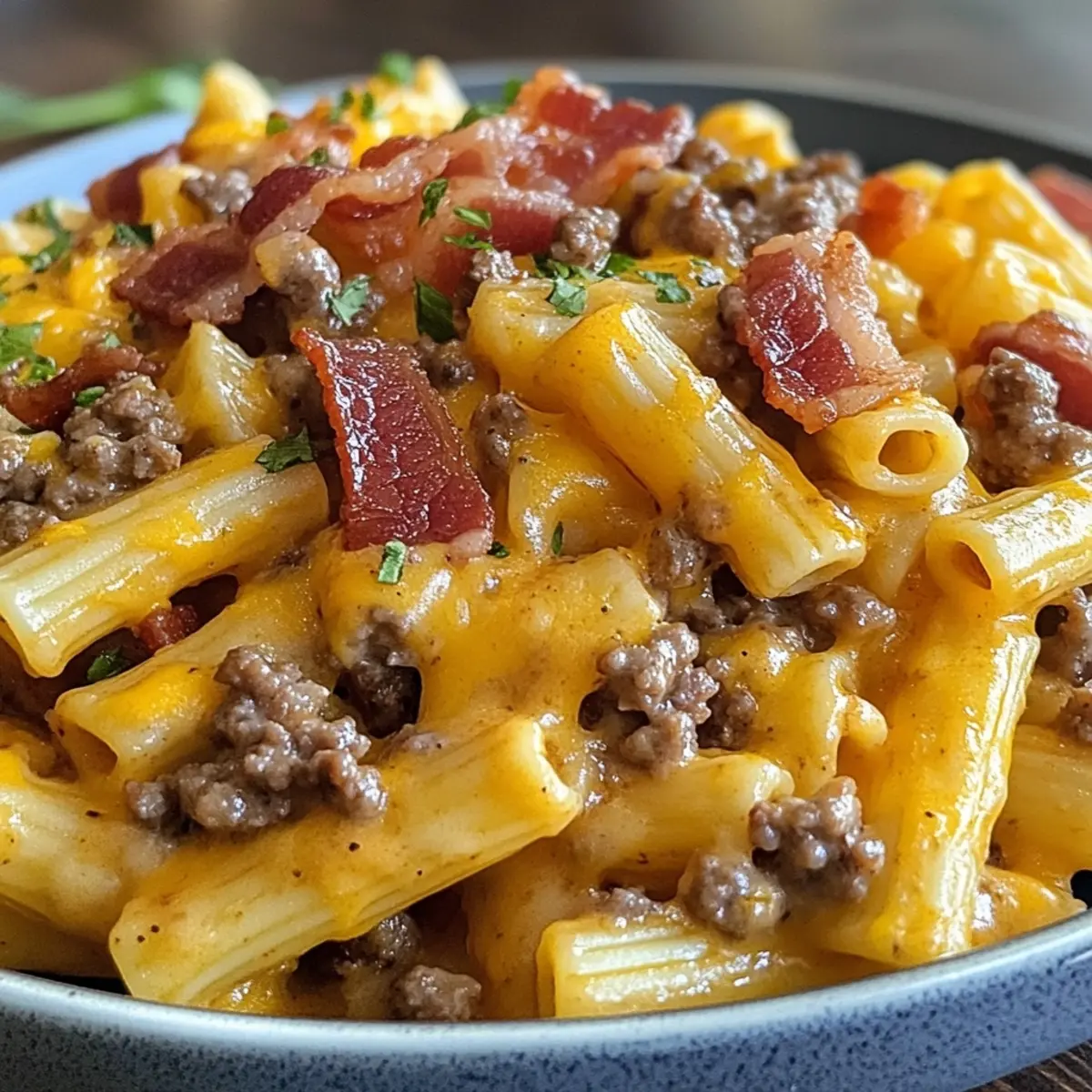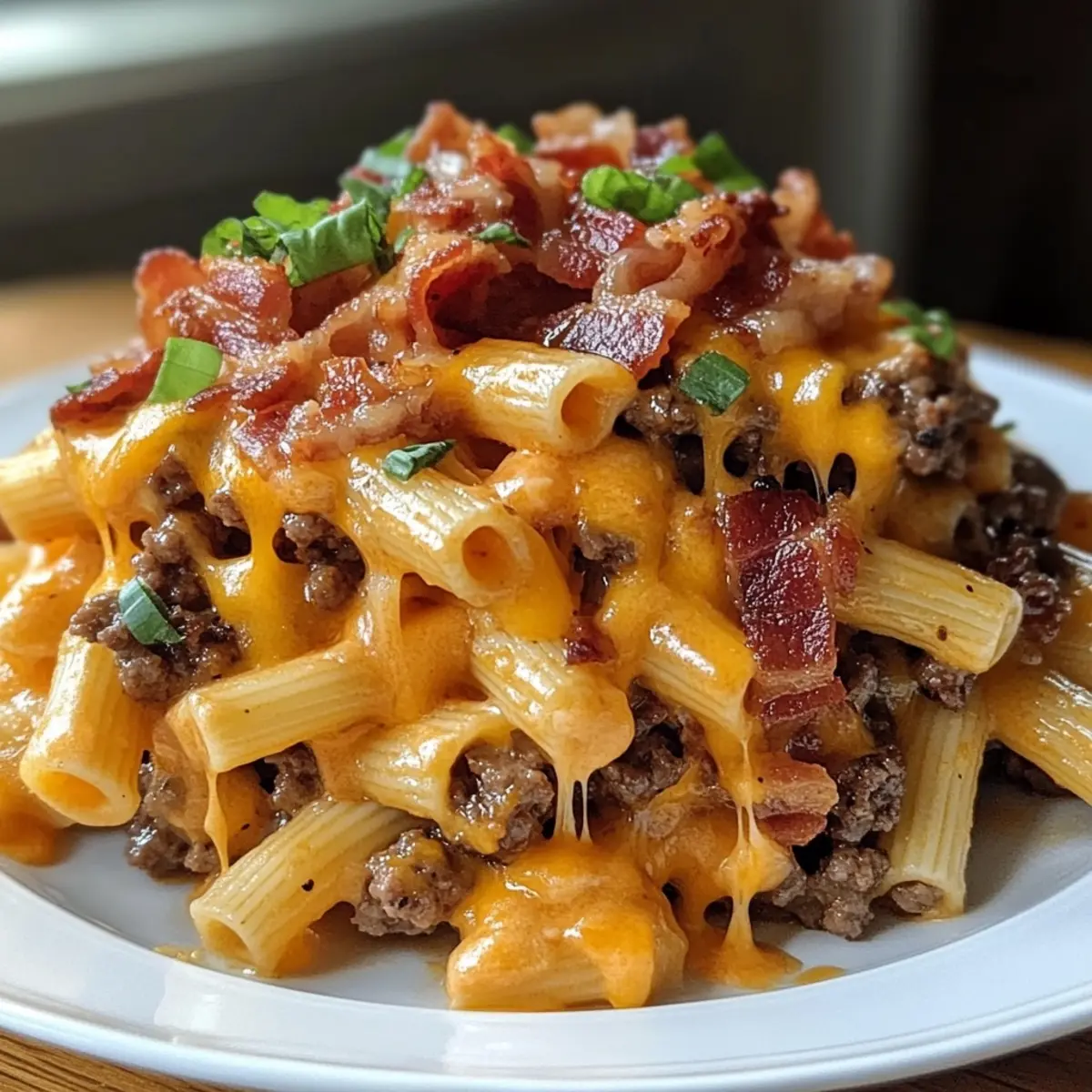 - Plate your Loaded Bacon Cheeseburger Pasta hot and delicious! Garnish with additional crispy bacon or a sprinkle of fresh parsley.