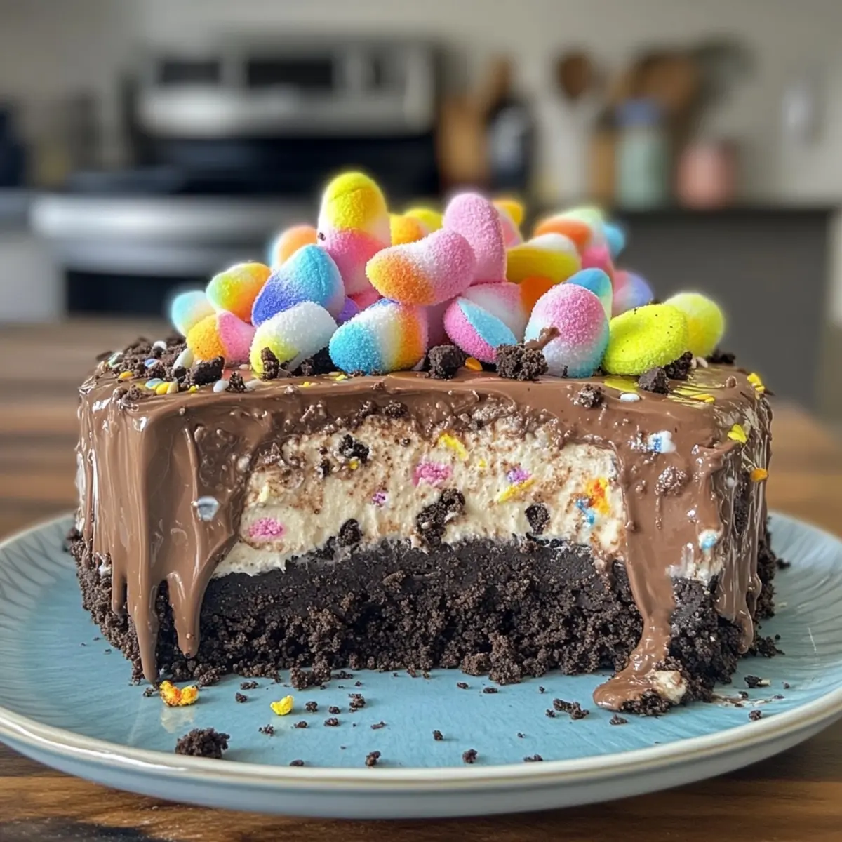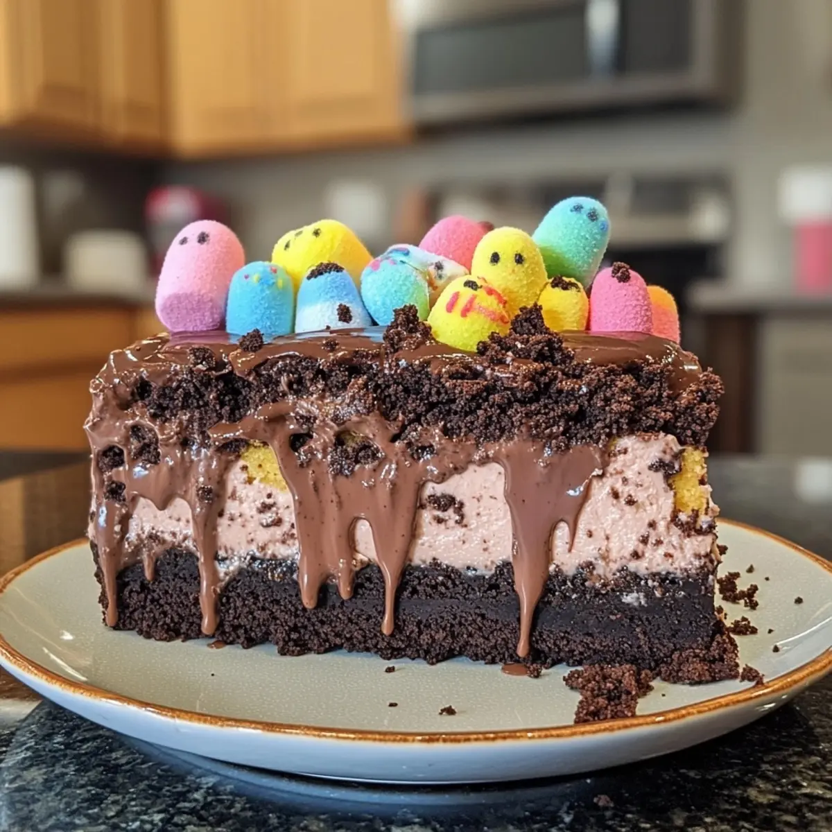 Eye-Catching Presentation: Vibrant toppings, including Peeps and pastel candies, make this dessert a stunning centerpiece for any table.